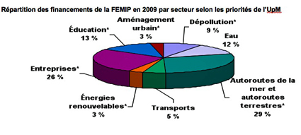 Très vite, l’implication de la FEMIP dans les projets de l’UPM est devenue l’un des piliers de l’action de la BEI dans les pays partenaires méditerranéens ( Algérie, Égypte, Gaza-Cisjordanie, Israël, Jordanie, Liban, Maroc, Syrie et Tunisie.). En 2009, déjà, 80 % des financements accordés étaient liés aux priorités mises en avant dans la Déclaration de Paris en juillet 2008 et dans les conclusions de la réunion des ministres des affaires étrangères de novembre 2008 à Marseille.